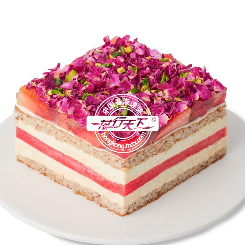 描述: 开心果、玫瑰花瓣、草莓、玫瑰味忌廉、西瓜、杏仁餅底组成、方形草莓西瓜蛋糕(12 x 12cm)。