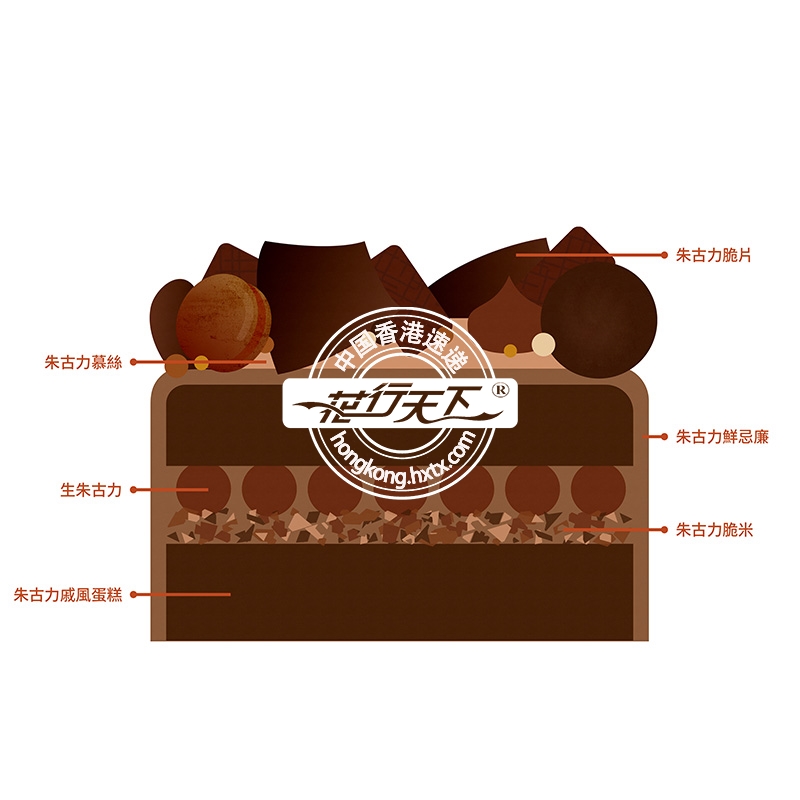 生朱古力, 朱古力戚风蛋糕, 朱古力鲜忌廉, 朱古力慕丝, 朱古力脆米组成、双重朱古力蛋糕(直经:20cm).